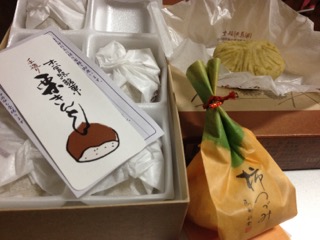 いや〜、まいったね。 われら庶民にはちょっぴし敷居の高い扉を開けての突入だったのに 売ってないとは! どうする?どうするよ!? どうするってボンビ〜なまわさび、「買いません、栗きんとんでないのなら」 すると、重い空気に刺激を受けたか(笑)、同行者の友が財布を取り出した。 次に入った和菓子屋さんも栗きんとんは販売終了。 次のお店では店先に「2月で終了しました。」と看板があった。 仕方ないから駅前の観光センターへ。 ここは中津川市内の銘菓を一同勢ぞろい、各お店の栗きんとんを一つずつ入れた味比べ出来るセットもあるのだ。 ここでまだ栗きんとんを販売中ながら徒歩ではたどり着けないお店の栗きんとんをゲット。 「恵那福堂」さんの栗きんとん 原材料は、栗と砂糖だけ!! 手前の「柿つづみ」というのは干し柿の中に栗きんとんを詰めたお菓子 これもまた添加物なしの逸品でどっちも食べたい欲張りにはうってつけ。 この友さ、お土産病にかかっちゃったみたい。 「すや」を起点に三歩歩いて二個買うわ? 名古屋を離れてもまだ買う!? おい、やめれ!! ストップをかけたくらいだ。 中津川まで行きながら馬籠も妻籠も行かないって・・・ 食べ物に執着するあまり 時間切れ〜 ちゃうちゃう、南木曽?中津川駅前!?