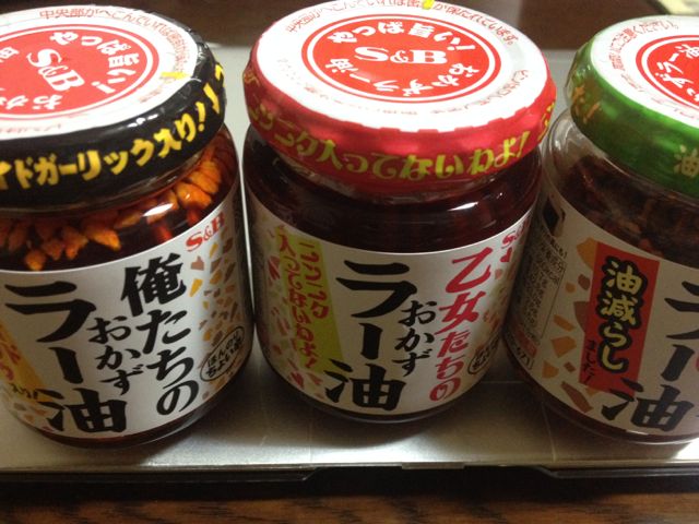 もうね、ふとんがジットリ? ペチャンコ? 私はさ、調湿敷きマットがあるからまだいいけど、 出勤日に晴れ間が出るつぅ〜ね・・・ 洗濯だけは主夫こま父も自主的に参加しないのよねえ。文句言われるから かもだけど。 さてさて、 カラッと乾かない日が続くわりにお肌は乾燥の一途をたどる運命?人呼んで“高齢化”とも言う?言わない?? 職場はさ、空調のせいもあってカラッカラなんだよね。 そんな話をしていたら、みんな、結構お肌の手入れしてんのね〜!? 社長夫人なまわさびはさ、ボンビ〜も手伝ってどんどん野生化してるってか! ボディシャンプーは使わねえ!ついでにシャンプーも使わない湯シャンに切り換えて、最近じゃお風呂上がりの化粧水も忘れがち・・・(オイッ!) でもね、湯シャンに切り換えてから指先とかかとの荒れが治っちゃったんだよね。ただの季節移りの加減かもしれんけど。 リップクリーム断ちしてクチビル荒れともおさらばしたし、世の奥方様方とはとっても離れた生活習慣っす。 だからなに?ってわけじゃないし、素顔じゃ外に出る勇気なしのシミ付き普通のオバチャンさ!(フンッ) 元々、お化粧を一生懸命するタイプじゃないからさ〜、一生懸命お化粧してるオバチャンに遭遇するとハア〜と感心しちゃうんだよね。 一生懸命を通り越してる同僚の“マス カラ子さん” この人のマスカラはすごい!!! まつげに毛玉が出来てる!? そしてまぶたにテ〜ン テ〜ン テ〜ン♪ 郷ひろみの禁猟区じゃないけど、まぶたにマスカラが点々点々・・・・ さらに夕方になると滲んでパンダちゃんにヘンシ〜ン。 1週間も使うとマスカラもカラッカラでなくなっちゃうんじゃないかしら?(ー ー;) でも言えないよね、「厚過ぎない?」なんて。 マスカラの話題で盛りあがった日、帰宅すると 右から「俺たちのパラパラおかずラー油 油減らしました!」 「乙女たちのおかずラー油 ニンニク入ってないわよ!」 「俺たちのおかずラー油 フライドガーリック入り!」 こんなカラ三兄弟が届いてた〜!! カラ続きですな。(笑) さっそく、こま父シェフが、 蒸し鶏に掛けて。 こちらはおかずラー油の王道とも言うべき「フライドガーリック入り」。 フライドガーリックの食感ガツンと、うまいっ、止まらないぜよ。 サラダに掛けた「油減らしました」のパラパラおかずラー油 ふんふん、確かにサクサク感ありね。サラダには少量のドレッシングも掛かってるから良い塩梅、グッドよ〜ん。 げっ!前日と同じサラダが出て来たやんけ・・ こちらは「ニンニク入ってないわよ」の乙女たちのおかずラー油。 マジで!?本当にニンニクなし?と疑ってしまうこの風味はなに?病み付き認定〜! どれも美味しかったけど、個人的にはフライドガーリックの食感にやられたってとこかしら? でもさ、会社行くのにためらいなくガッツけるのはニンニクが入ってない乙女たちのラー油よね。 この「おかずラー油」三兄弟は危険だわっ! ご飯もりもり、 食が進み過ぎだつぅ〜の・・・