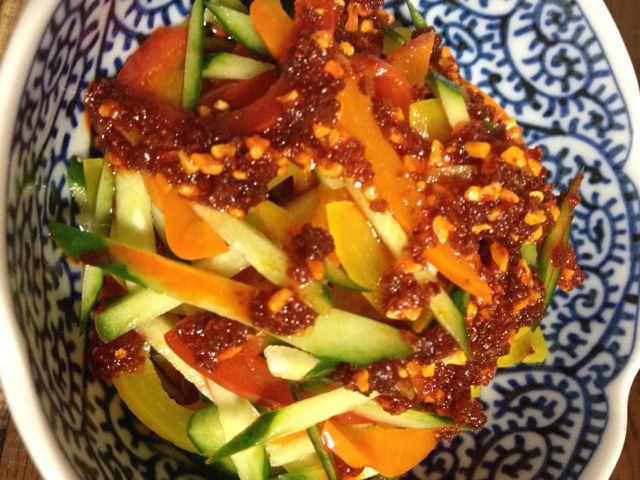 もうね、ふとんがジットリ? ペチャンコ? 私はさ、調湿敷きマットがあるからまだいいけど、 出勤日に晴れ間が出るつぅ〜ね・・・ 洗濯だけは主夫こま父も自主的に参加しないのよねえ。文句言われるから かもだけど。 さてさて、 カラッと乾かない日が続くわりにお肌は乾燥の一途をたどる運命?人呼んで“高齢化”とも言う?言わない?? 職場はさ、空調のせいもあってカラッカラなんだよね。 そんな話をしていたら、みんな、結構お肌の手入れしてんのね〜!? 社長夫人なまわさびはさ、ボンビ〜も手伝ってどんどん野生化してるってか! ボディシャンプーは使わねえ!ついでにシャンプーも使わない湯シャンに切り換えて、最近じゃお風呂上がりの化粧水も忘れがち・・・(オイッ!) でもね、湯シャンに切り換えてから指先とかかとの荒れが治っちゃったんだよね。ただの季節移りの加減かもしれんけど。 リップクリーム断ちしてクチビル荒れともおさらばしたし、世の奥方様方とはとっても離れた生活習慣っす。 だからなに?ってわけじゃないし、素顔じゃ外に出る勇気なしのシミ付き普通のオバチャンさ!(フンッ) 元々、お化粧を一生懸命するタイプじゃないからさ〜、一生懸命お化粧してるオバチャンに遭遇するとハア〜と感心しちゃうんだよね。 一生懸命を通り越してる同僚の“マス カラ子さん” この人のマスカラはすごい!!! まつげに毛玉が出来てる!? そしてまぶたにテ〜ン テ〜ン テ〜ン♪ 郷ひろみの禁猟区じゃないけど、まぶたにマスカラが点々点々・・・・ さらに夕方になると滲んでパンダちゃんにヘンシ〜ン。 1週間も使うとマスカラもカラッカラでなくなっちゃうんじゃないかしら?(ー ー;) でも言えないよね、「厚過ぎない?」なんて。 マスカラの話題で盛りあがった日、帰宅すると 右から「俺たちのパラパラおかずラー油 油減らしました!」 「乙女たちのおかずラー油 ニンニク入ってないわよ!」 「俺たちのおかずラー油 フライドガーリック入り!」 こんなカラ三兄弟が届いてた〜!! カラ続きですな。(笑) さっそく、こま父シェフが、 蒸し鶏に掛けて。 こちらはおかずラー油の王道とも言うべき「フライドガーリック入り」。 フライドガーリックの食感ガツンと、うまいっ、止まらないぜよ。 サラダに掛けた「油減らしました」のパラパラおかずラー油 ふんふん、確かにサクサク感ありね。サラダには少量のドレッシングも掛かってるから良い塩梅、グッドよ〜ん。 げっ!前日と同じサラダが出て来たやんけ・・ こちらは「ニンニク入ってないわよ」の乙女たちのおかずラー油。 マジで!?本当にニンニクなし?と疑ってしまうこの風味はなに?病み付き認定〜! どれも美味しかったけど、個人的にはフライドガーリックの食感にやられたってとこかしら? でもさ、会社行くのにためらいなくガッツけるのはニンニクが入ってない乙女たちのラー油よね。 この「おかずラー油」三兄弟は危険だわっ! ご飯もりもり、 食が進み過ぎだつぅ〜の・・・