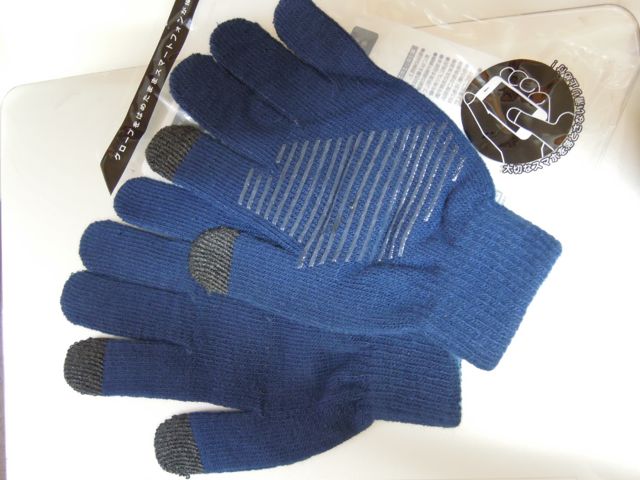 これでコタツに入りながら使えると喜んだものの、タッチパッドが冷たくてかなわんよ。アルミの上を指先でズーズーやるんだから冷たいってば!デスクトップの時はマウスだったから手袋も出来たしね。 ん?・・・ 手袋!! 今ってスマホ用に特殊糸を編み込んだ手袋あるじゃ〜ん。 たったの¥156!しかも、スマホの形状に合わせた滑り止め付き。 もったいぶって、こま父にもプレゼントしたわ! よっ、良妻なまわさび!! あの〜、ワタクシ、スマホ持ってないんですけど〜。 もう電池が持たない死にそうなガラケーなんですけど〜。 当初の目的を忘れてた! パソコンのタッチパッドが冷たいから欲しかったんだっけ。で、いざ手袋をはめて、スルスル〜、ナイスよ。スクロールする時に中指も使うんで、そこが少しばかり扱いづらいけど慣れよね、バッチグー。(古っ!!) しかしですね、 なぜ? 家の中で、 手袋をする必要があるのか? 私は聞きた〜い! 資金繰りで悩める脳みそをクールダウン中なのですよ!?