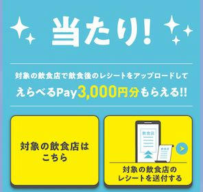 あたりが出たら、対象の飲食店を利用してそのレシートを送るとえらべるPayがもらえる。 あたたたたた〜っ して、対象の飲食店ってどこ? わかりにくいったらありゃしない・・・ こま父引き連れて行って来やした。 最初に500円ちょい 飲食店で2780円 えらべるPayは 3000円! |
