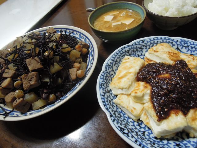 なんでかわからないけど、急に焼肉が食べたくなった。 どういうわけか、子供たちがまだ食べ盛りの頃、焼肉屋さんで諭吉が飛ぶ恐怖におびえながらワイワイガツガツ外食した日を思い出した。 台所の片隅に追いやられてるホットプレートを取り出せば、外食するよりお手軽に焼肉が楽しめる!わかっちゃいるけどやらないよ。(オイッ!) 以心伝心? こま父、珍しく「肉、食いたいなあ〜」 夫婦してこんな風に思うのは余程の肉欠乏症か?それを言うなら、魚の登場の方が断然少なくない? よし、じゃ、今宵は謝肉祭じゃ〜!? なんか・・・違くね? え〜っと、豆腐のみそ汁で大豆攻め! 賞味期限切れの豆腐と自家製3年前味噌で田楽、あららダブルダイズ! 豆と高野豆腐がひじき色に染まった真っ茶色だいず! ( ゚ Д ゚!)・・・・マヂカッァァァ 全部! ヤバそうな? 畑のお肉・・・