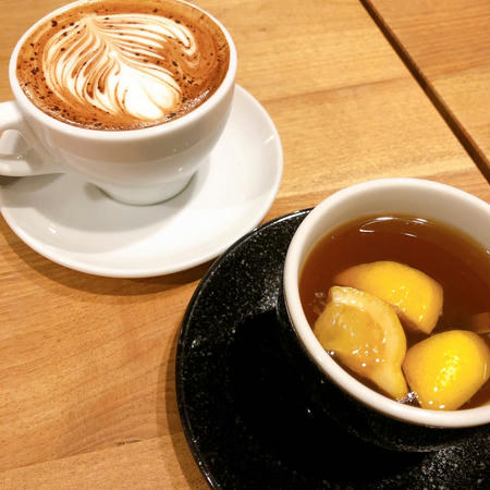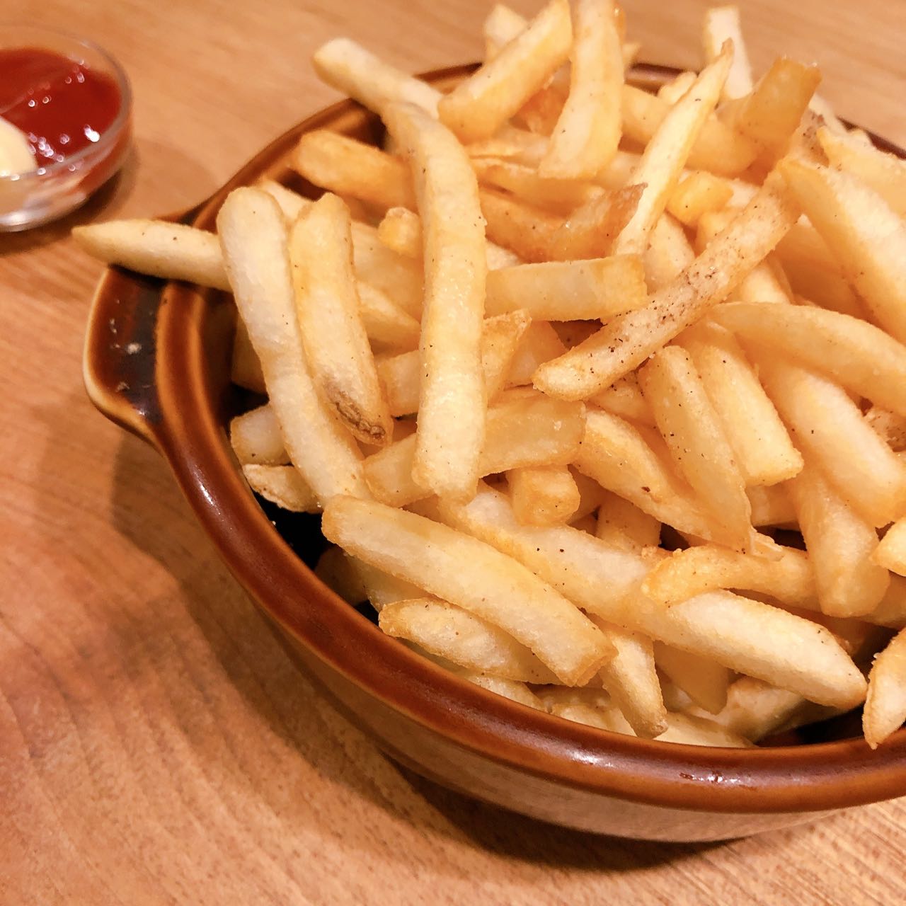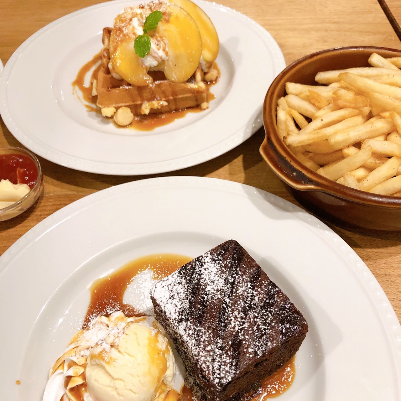 裏口には薪が山積み! これ見た時、ピザ1枚で済むのか・・・? 不安はよぎったけど予約しちゃってるから行くっきゃない。 マスターがメニュー表の説明をしてくれた。 まずこちらからドリンクを、 セットメニューはこちらで、 い、い、い、いいんですぅ〜 ピッツァ単品で・・・ アチアチ アチチ〜 窯から出てきたピザを手で持ったら熱いに決まってるっつぅ〜の。 大っきめのピザを1枚ずつ食べたらお腹いっぱいでっす。 自腹分¥400支払って次の会場へ〜 こちらは純粋にデザートを楽しむつもりで。 端っこにちらり写ってるのは?? 店員さんが親切にgo to基準の2000円に少し足りないと教えてくれて追加したヤツ。 山盛りポテト!! |