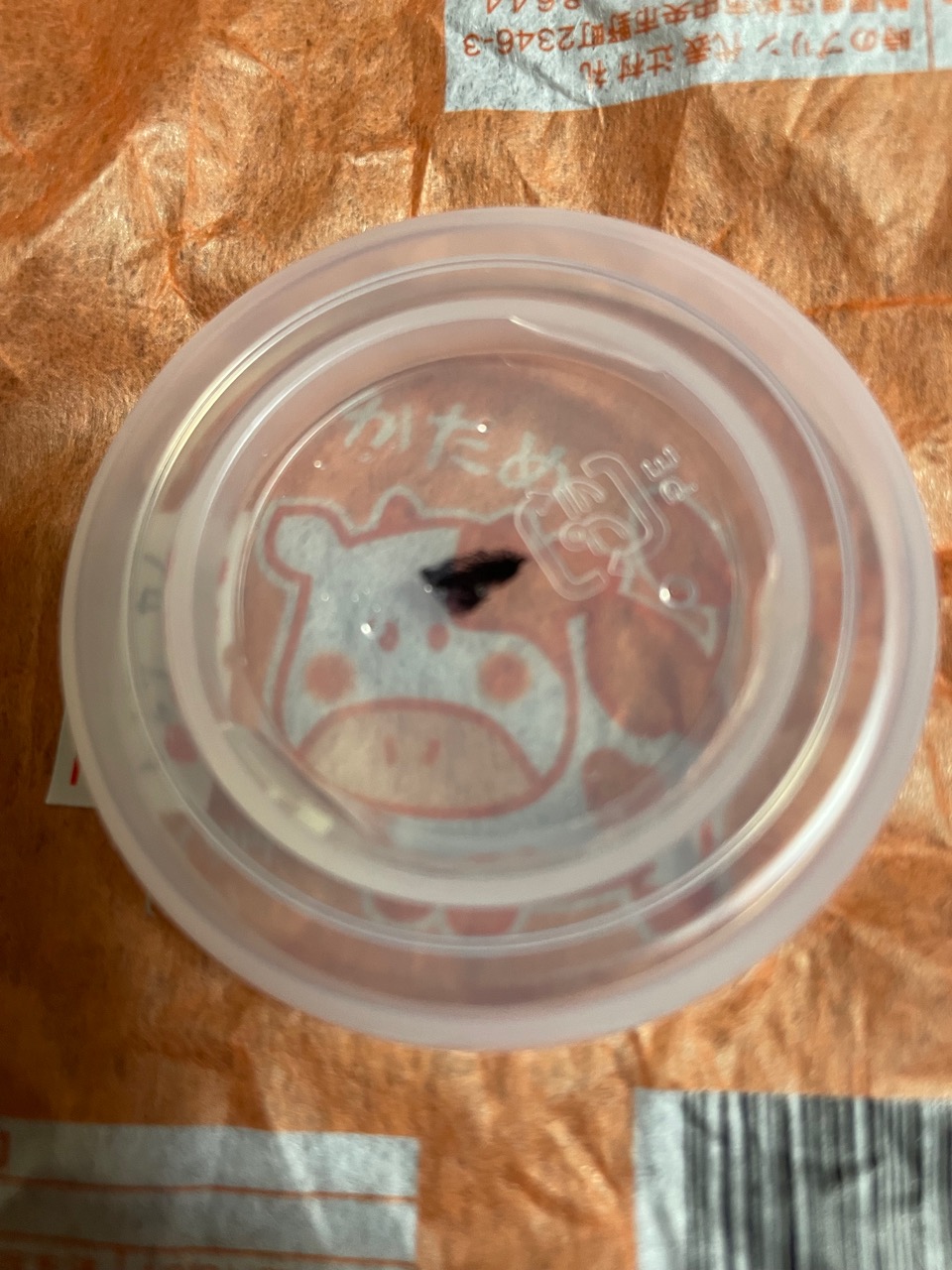 スイーツフェアでおいしそうだったからって カスタード系大好きなワタクシ わっくわく〜 被せ紙をはずして・・・ んっ? これは?? こま父のぷりんにも同じように 海苔? マジックペン? |