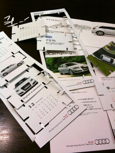 車好きのこま父、将来はアレに乗りたい!コレに乗りたい! 将来ってねえ・・・ 望みを叶える展望は月日とともに薄くなり、とうとう神頼み!? (*´・ω・。)σィヂィヂ 懸賞やモニター応募に忙しそうだ。しかしですね、お好みの車がそうそう都合良く懸賞になってるわけもなく、 本末転倒?? のべつ幕無しの応募を重ねている模様。 アウディから少し大きめ厚手の封筒が届いた!! こ、これは・・・ (´・ω・`)ショボーン 入っていたのは冒頭の写真、組み立て式のカレンダーです。 悪戦苦闘すること数時間。 どうあっても、上手い具合に組み立てられません。 音を上げてアウディに電話した、こんなことでねっ。 アウディのコンセプトともいえる、 遊び心のあるカレンダー。 特に決まった組み立て方はありませんので、 ご自由に組み合わせてみてください。 すべての「月」が見えるようには、 組み立てられませんので。 ハイ、た〜んと遊べました。 ランキング参加中です。 クリックしてくださると弄びますデス。 PR |