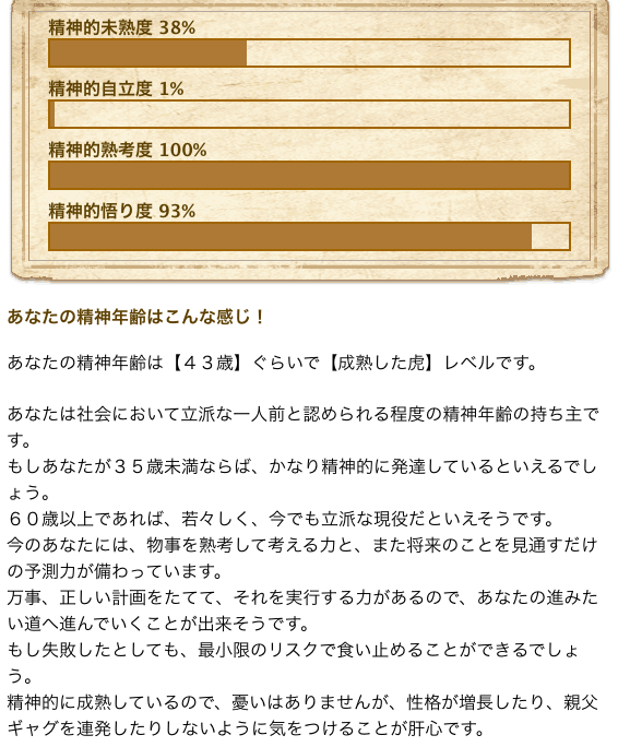 とはいえ、ほんの少しだけ? ジリジリの“ジ”くらい? 目覚めたら、朝が来たのはわかるけど曇りなのか晴れなのかまだ判断がつかない夜明けって感じ? ここでバッサリ意見が分かれた こま父と私。 焦らない方がいい、果報は寝て待て VS もう待てない、善は急げ 一時違えば三里の遅れになるか、慌てる乞食でもらいがなくなっちまうのか、 この先の結果なんかわからない!! かといって、手をこまねいてる私じゃない。 「五十にして天命を知る」 あら〜、残念!! 私の脳ミソは孔子さんのかけら程の知力も考察力も哲学もないので天命どころかこの先どうしたらいいかもわっきゃりません。 ってことは、わ〜い、50歳未満!(ぐふっ) ならば、いくつかのサイトで精神年齢を測ってみた。 いやいや、まいったね〜。 お若いっ!! 43歳だってさ〜。 どこかのサイトでは24歳!! これを若いと喜ぶか未熟者と反省するかはさて 老いて 置いて、自立度が1%ってなに!?(下表を見て〜) まったく自立してないけど悟りだけはバッチグー? それって、わがままな老人の晩年じゃね? 勘弁してくれ・・・ ☆ 結果表だよ〜ん ☆ 遊んでる場合じゃないよ、現実の世界は厳しい。 悠長なこと言ってたら全然進展しないじゃん。 私はね、50にして就活を始めることにした。 続く リストラのお年よ〜! 売り手市場ってね、 オバサンじゃないから! やるっきゃない!(← 再び)