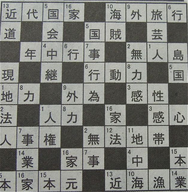 漢クロは問題ないんですよ〜。マス目にある小さな数字に対して、ひとつの数字には全て同じ漢字を入れて単語、熟語が成り立てばOK。