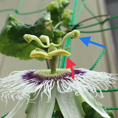 な、ぬぁ〜んと、こま2号、兄のこま1号を出し抜いて完全独立と相成りました。 おめっとさ〜ん!! それにしても都会つぅ〜のはよく歩かねばならない。 駅ビルっていっても長〜い地下街をあっち行きこっち行き・・・ 駅直結のホテルだってドアtoドアって言えない距離を歩かねばならない。 履きなれない大昔のヒールでカツカツ歩き倒した結果、足の裏重症!? さて、 留守の間に先日の受粉からどうなったか気がかりだったパッションフルーツ。 こんな成長が早いとは! これは楽しみ。 新しい花が咲いたから人工授粉するべ。 赤矢印が雄しべ 黄色い花粉がいっぱいついてる〜 ひとつちぎって、青矢印の雌しべにこすりつけた。 花が咲いてすぐの雌しべは上を向いているけど、受粉の態勢が整うと写真のように雄しべに近づいて来るらしい。 綿棒でやる?、雄しべをひとつちぎる?、いろんな方法があるみたいだけど、今回は雄しべをひとつ拝借。 拝借っていうか 綿棒を取りに行くのが めんどくさかっただけ〜 それにしても足が痛い。 パッションフルーツ御殿?目指して踏ん張った!(爆) にほんブログ村 ランキング参加中です。 捕らぬ狸の皮算用中な私に応援のポチお願いします。 PR |