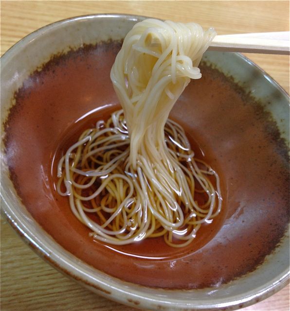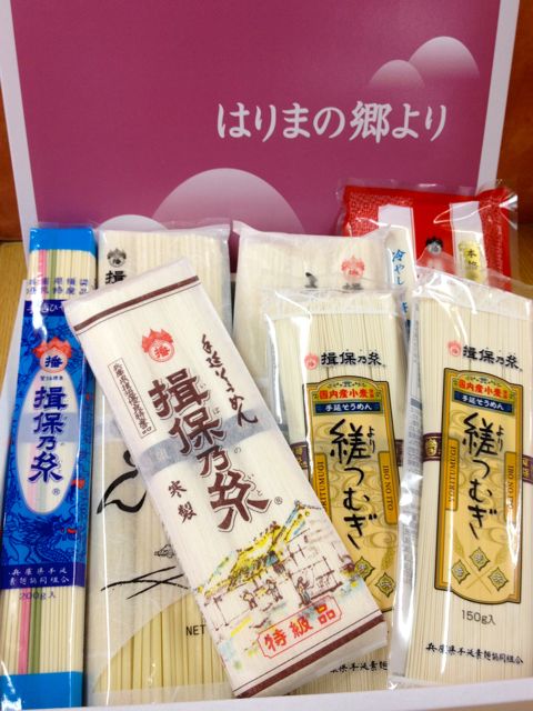 次々と出来上がった順にテーブルに並べられた手料理の数々! こま父のテンションマックス!? まさか、まさかね、 ほとんど?、 大半??が、 クール便に乗せられるとは思ってなかったみたい。 ぷぷっ カニカマで誤摩化された具材は、ほうれん草のごまあえといなり寿司用に煮たアゲ、青じそと南高梅を叩いてグチャッと和えた甘酸ミックスの冷やしうどんだ。 ベースの味付けは“困った時のお茶漬けの素!“をまぜまぜ。 あとは、詰め放題から取り残された鳥のエサほどのおかずの数々。ま、残り物とも言うね。じゃ、食べようか! いっただきまぁ〜す。 で、こま父、唸る。 「うまいっ!!」 揖保乃糸って言ったら「そうめん」でしょ! どころがどっこい、うどんも中華麺も、もちろん冷や麦もあるのだ。 な〜んて、えらそうに言ってる私、はりま製麺のうどんは初めてお見掛けしたよ。これを茹でて出したんだから美味いに決まってんじゃんねえ。 はりま製麺の乾麺ってみなさん細身。このうどんも例外にあらず、カニカマと比べても細いでしょ?だけどコシがあってツルツルモチモチした食感がたまらんわぁ〜! この【黒帯】って素麺は、熟練した製造者しか作る事が許されない、まさに本物の特級品なんですって! 独り占めするのもモッタイナイ。 日頃、お世話になりっぱなしのご近所仲間“オババ連”の二人に一束ずつ、「味見して〜」と持って行った。 「あ〜、揖保の糸だ。」と目敏く叫んだオババ約1名。 「いつも食べてる!」 だから、私は即座に解説を始めた。 コレコレしかじかアノネノネ、すっごい貴重品だから大事に食べよ!と。 解説にオババは応えた。 「私、いつも黒(帯)の食べてる。」 (うそつけ〜!!) 黒じゃないだろ? 赤か紫でしょう〜が!と言ったところで、記憶も定かでないオババ連。 ああ、帯の色もわかんらんのだから味の違いなんてわからんだろ・・・ こりゃ、モッタイナイことしたなあ・・・ お裾分けをチラリと後悔したドケチなまわさび。 (そうめん1束でブログにこんな書かれようなオババ連、スマヌ・笑) 後日、「美味しかったっ!!」と飛び込んで来たオババ連メンバー。 顔にはもっと欲しいと書いてあった?気がすれど、残念〜、もう無いよ。 ここで買いなさい。(o^皿^)\ニッ♪ はりま製麺株式会社 いや、腸を通り抜け、今頃・・・(オイッ!!)