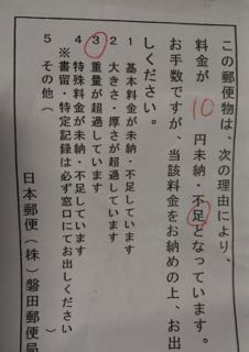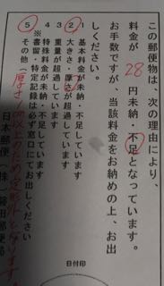 郵便局まで行くべきか、はたまた、近所のポストで済ますべきか、 悩みに悩んで近所のポストを選択した。 速達で出せってか? そこまで急ぐ義理もないんだなあ 翌日、仕事から帰ると あちゃー!! なんたること、重量オーバー たった10円足らずで舞い戻ってきた。 コンビニのお兄さんがわざわざ計ってくれて25gをほんのちょっとオーバーしてるって。 25g?? ワタクシとしたことが50gと勘違いしてたわぁ〜 10円切手を貼ってその場で投函 やれやれ 台風が来る前に発送できてメデタシメデタシ と思ってたら、またまた舞い戻ってきた! 今度はこれ なんですと!? 10円足らんっていうから追加したのに、まだ足りない? 最初は1cmの関門を通過で2度目はダメ? 一応、うちで測ってみたけど1cm内に収まってると判断しての投函だった。 ダメならダメで最初から言えよっ! そうしたらこんな無駄足踏むことないじゃん! 郵便局へ電話したね。 こんないい加減な判断で2度も戻すって、結局は2度配達してるようなもんじゃないの? 雨の中、郵便局の人が来てくれた。 今からすぐ発送すると平謝り。 こちらも雨の中、わざわざ来てくれて、この人に罪はないし(たぶん) 28円の追加は不要だって! じゃあさ、 差し戻しはなんだったの? 気分で判断しとんのか!(爆) にほんブログ村 にほんブログ村 ランキング参加中です。 なんか恨み買った? 心当たりなくもない?(えっ)私に応援のポチお願いします。 PR |