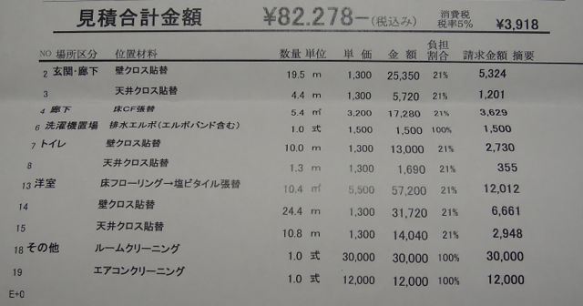 こま1号がお世話になっていたワンルーム。 重量感たっぷりの椅子が床をこんなにしてしまった!! 最初に連絡を受けたときは、ここまでひどくなかったのに・・・。 マットを敷いて対策してたのに、取り去ったらこの状態だったと言う。 引越しの時、とにかくキレイにしなくっちゃとばかりに掃除を始めて気がついたんだけど、ちょっとでも剥がれたとこに雑巾が当たったりするだけでパリパリ〜と気持ちよく(って、オイッ!)剥がれちゃう。 これはもう・・・、覚悟だね・・・。 覚悟って、一体いくら掛かる〜? (>ω<、) ドキドキの引き渡し時の立ち会い。 追い打ちの宣告!! 「たばこを吸ってらっしゃった?」 「壁紙が結構キテマスね。」 え?なにが?? なにが来てる?着てる?? 吸い出して、すぐに禁煙したんじゃないの? 全面張り替えだとよっ!! 壁紙よ、オマエもか・・・ だから言ったのに。 とはいえ、こま1号ひとり吸わなくても溜まり場だったらしいから。 自分で自分を納得させ・・・きれないうちに、 続いてまたもや衝撃の一言!! エアコンのクリーニング負担は喫煙した側の・・・ il||li _| ̄|○ il||li 敷金は2ヶ月分、確か14万だった気がする。 家賃7万円だったからね。 実は借りたときの不動産屋さんは行方不明になってしまい、途中で管理会社が変わったのだ。 「敷金は2ヶ月分の13万6千円お預かりしてます。」 やっぱり!!( ̄个 ̄) でも、あの時、共益費はなくて家賃7万だった・・・ しかし、書類がないんじゃねえ。 新しい今の不動産屋さんの契約書などの書類はすべてこま1号へ届けられていたから、ちゃんと確認してなかった〜。 4千円、今となっては本当に勿体な〜いっ。 「振込先は〇〇銀行でよろしかったですね?」 おいっ、 なんで? こま1号の懐に入るようになってんだっ!?