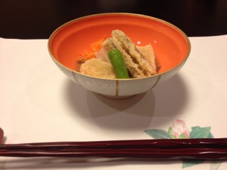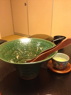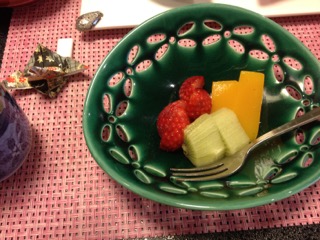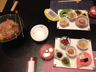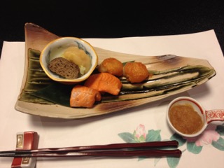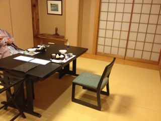 ダイヤルバスが玄関前でブレーキをかけると着物姿の女性が2名、お出迎えに見えた。 「お荷物をお持ちします。」 お気使いいただいたけど、なんせパンツ一丁持って来ただけなもんで、持ってもらうほどの荷物はごじゃりませんことよ。 フロントで若女将が遠いところからようこそとあいさつしながら、「新幹線で?」と話題を向ける。 いや、参ったね! 貧乏一直線、鈍行一筋のキヨブタの旅ざんす。 女性は浴衣を選んで、お好きな小物を一品いただけるサービスあり。残念無念?、こま父はシュフだけど男だかんね。 では早速、お部屋入り口 入り口横の洗面台 窓際の椅子、写真が小さくてわかりにくいけどスンバラシイ! 天童木工だよ! 外の景色に感動しろってか〜?(笑) 姿見の前にはこんなスツールも 調度品が凝ってるお宿で〜す。 到着してすぐにお抹茶と手作りの水羊羹とおこしをいただきマンモス☆ ひとっ風呂浴びて、ゴロンゴロンしてたら待望のお食事タイム。 お料理の宿と聞いてココに決めたんだけど、ボンビ〜なまわさびのお口に合うかしらん? 個室!! 重役のように反り返ってるのはこま父。写らない様にのけぞっても無駄だった。 スタート〜! 「前菜」 渾身の能書きお品書きによれば、 梅の花を思わせる器の中心にあるのがフォアグラのコンフィーでクラッカーと一緒に食すそう。 お品書きには、もっともっと詳細に書かれていたけれど省略させていただきやす。 前菜を食べ終わる頃に、カラダが喜ぶ吸物として「こんそめ」が出される。 和の「こんそめ」、写真は撮り忘れました。 「造里」 宝箱のような器がステキ 正方形の器には汲み上げ湯波。 なぜ写真が小さい?(謝) 「蒸物」 みぞれ蒸し これまた器がスンバらしく美しい! もち、シンプルに見えるけど手の込んだお料理は美味。 「合肴」 香煎揚げ 作りたて、あっつあつ! かけてある餡もサイコー、器を舐めてしまいたい。 「焼物」 ヤシオマスの塩焼き 手前の南蛮味噌焼もメインじゃないの?ってくらいの存在感。 この後、赤だしとシラスと大根のご飯、香の物。 そしてデザート。 お茶は最初に出た緑茶と替わってほうじ茶が出された。 どれもこれも大変おいしくいただきました。 手作りはもちろん、 作りたてのお料理は、温めたり冷やしたりした器に盛り付けられていた。 大変、美味しゅうございました! 個室でなかったら ボンビ〜の性、 緊張感で堪能できなかったかも?(笑) つづく 朝ごはんもすごいぜよ!